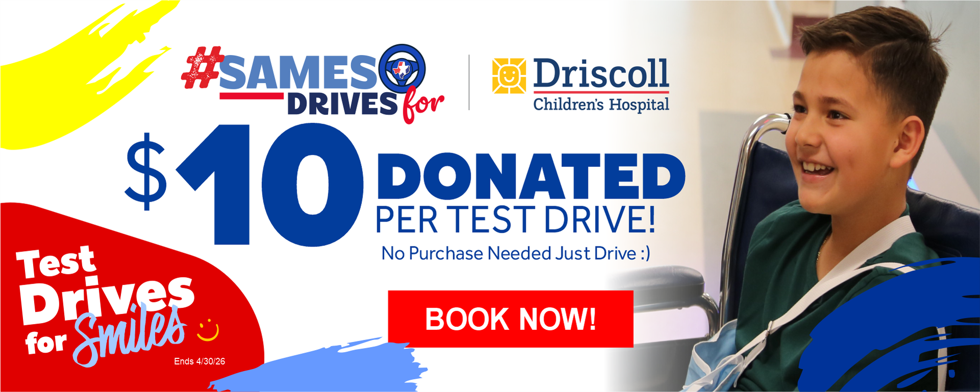 Another reason to come take a test drive this April: We are donating $10.00 per test drive to Driscoll Children's Hospital! Please come drive for smiles - no purchase needed just drive!